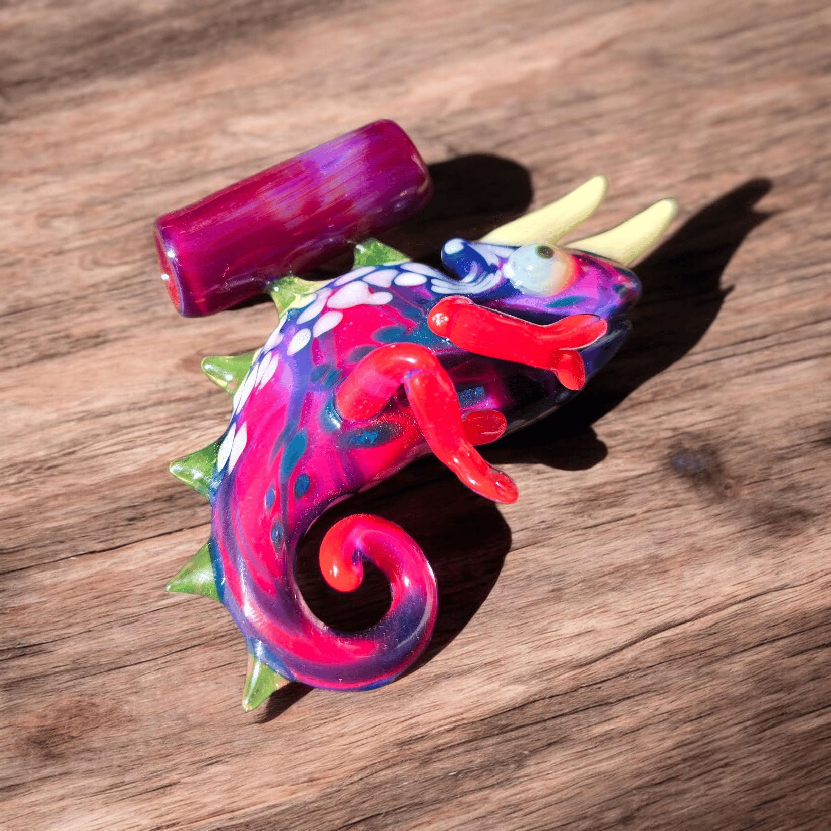 Glass chameleon pendant with UV reactive spikes.