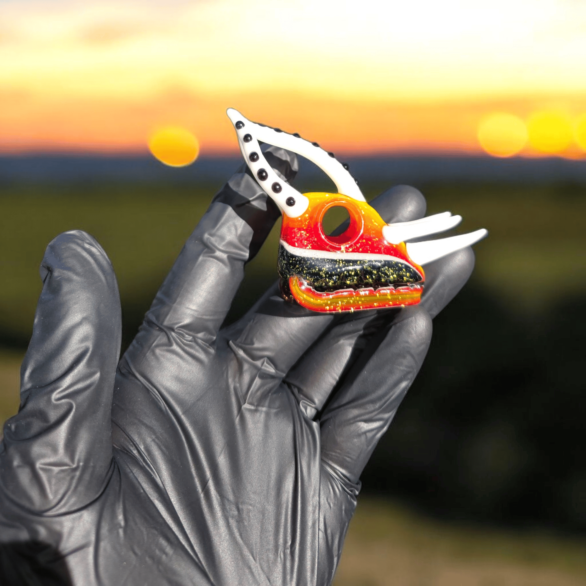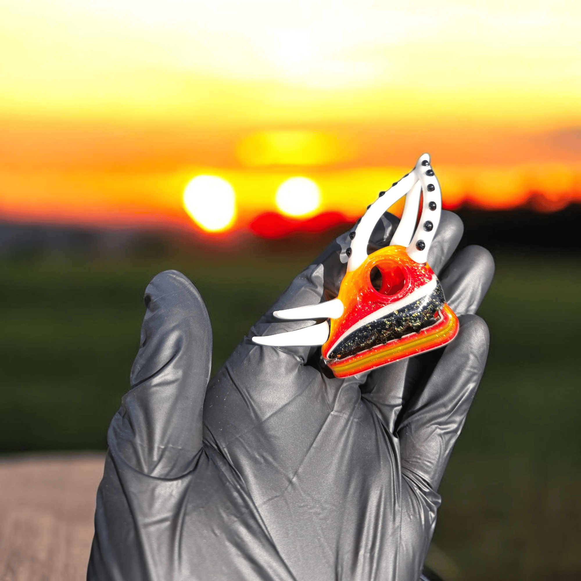 Hand blown, dichroic glass pendant features a chameleon skull.